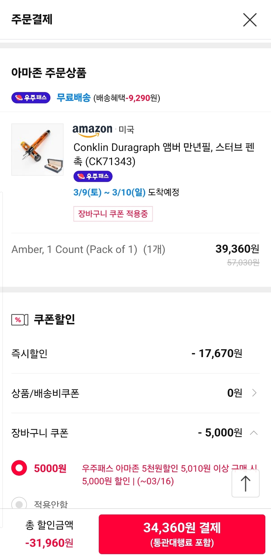 5천원 할인쿠폰이 있어 34,360원에 결제할 수 있었습니다.